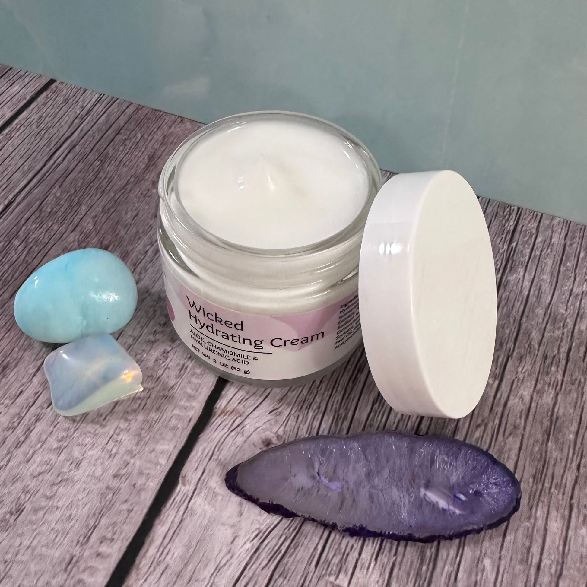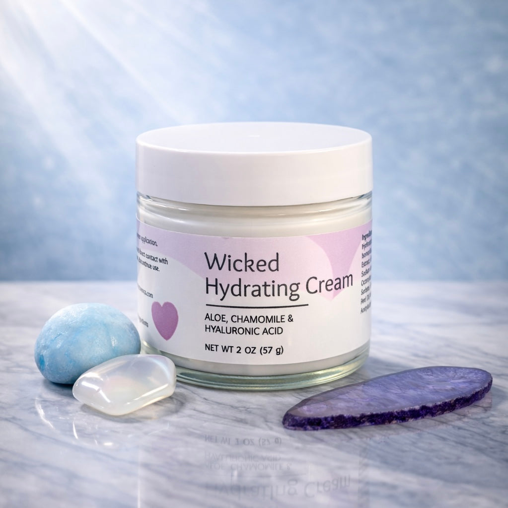 Wicked Hydrating Cream: Water, Squalane, Butylene Glycol, Glycerin,Tetradecane, Acetyl Hexapeptide-37, Whole Hemp Extract, Saccharide Isomerate, Sodium Hyaluronate (Hyaluronic Acid), Triisononanoin, Phenoxyethanol, Ethylhexylglycerin, Niacinamide (Vitamin B3), Calcium Pantothenate (Vitamin B5), Sodium Ascorbyl Phosphate (Vitamin C), Tocopheryl Acetate (Vitamin E), Pyridoxine HCl (Vitamin B6), Maltodextrin, Sodium Starch Octenylsuccinate, Silica, Aloe Barbadensis Leaf Juice,Chamomilla Recutita (Matricaria) Flower Extract, Hydroxyethyl Acrylate/Sodium Acryloyldimethyl Taurate Copolymer, Polyhydroxystearic Acid, Natural Fragrance.